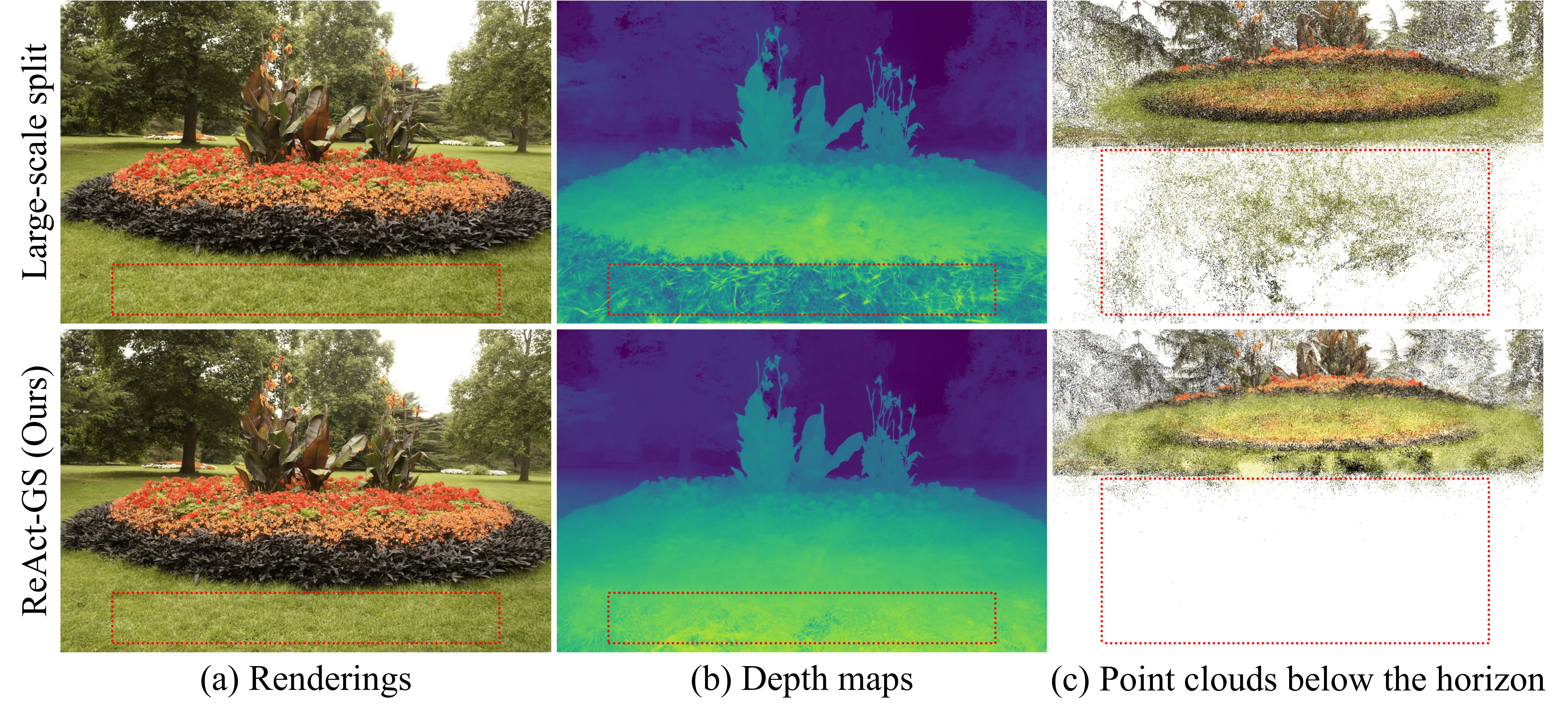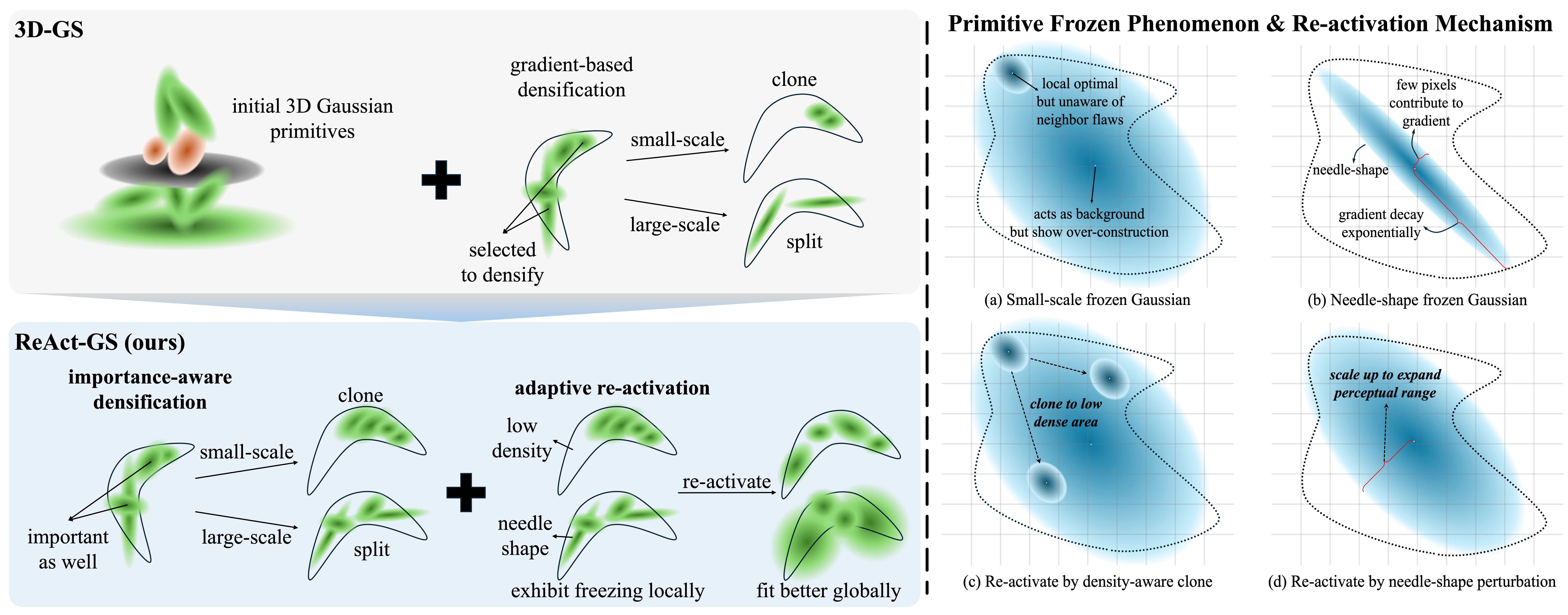 Key contributions of ReAct-GS. (Left) We identify the gradient magnitude dilution issue in the original average gradient densification criterion of 3D-GS. Instead, we propose importance-aware densification, which considers alpha blending weights in accumulated gradient magnitude, thus accurately identifying primitives that require densification to fit complex scenes. (Right) We also discover the primitive frozen phenomenon which causes persistent blurring and needle-shape artifacts. Accordingly, we propose a re-activation mechanism consisting of density-guided cloning and needle-shape perturbation, which comprehensively addresses over-reconstruction artifacts by strategically perturbing specific parameters of 3D Gaussians.